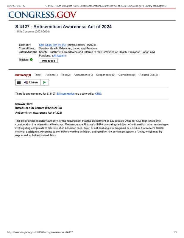 dropbox/COLLECTION- Legal/National Legislation/2024/4-16-2024/S.4127 - 118th Congress (2023-2024)_ Antisemitism Awareness Act of 2024 _ Congress.gov _ Library of Congress.pdf