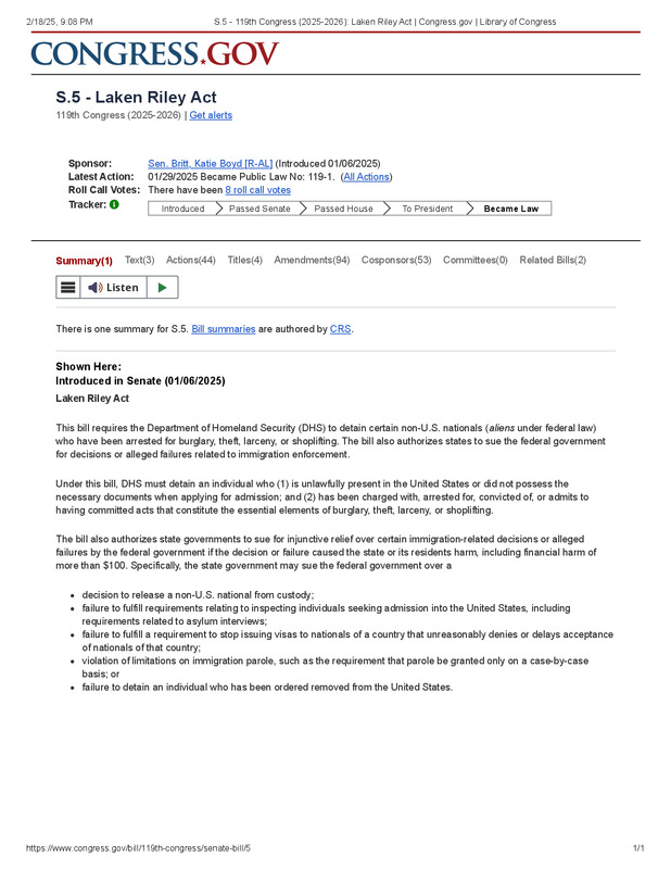 dropbox/COLLECTION- Legal/National Legislation/2025/1-29-2025/S.5 - 119th Congress (2025-2026)_ Laken Riley Act _ Congress.gov _ Library of Congress.pdf