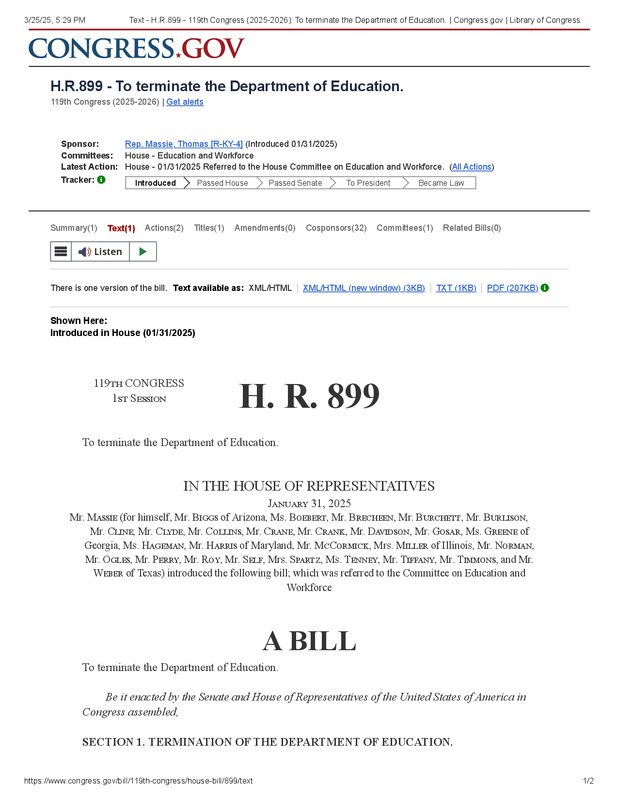 dropbox/COLLECTION- Legal/National Legislation/2025/1-31-2025/Text - H.R.899 - 119th Congress (2025-2026)_ To terminate the Department of Education. _ Congress.gov _ Library of Congress.pdf