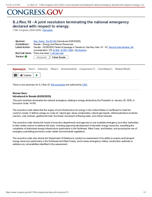 dropbox/COLLECTION- Legal/National Legislation/2025/2-3-2025/S.J.Res.10 - 119th Congress (2025-2026)_ A joint resolution terminating the national emergency declared with respect to energy. _ Congress.gov _ Library of Congress.pdf