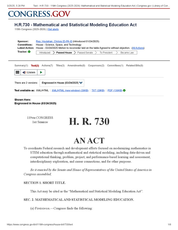 dropbox/COLLECTION- Legal/National Legislation/2025/3-24-2025/Text - H.R.730 - 119th Congress (2025-2026)_ Mathematical and Statistical Modeling Education Act _ Congress.gov _ Library of Congress.pdf