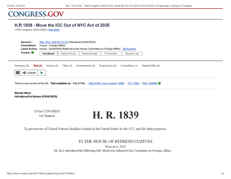 dropbox/COLLECTION- Legal/National Legislation/Crimes against humanity/Text - H.R.1839 - 119th Congress (2025-2026)_ Move the ICC Out of NYC Act of 2025 _ Congress.gov _ Library of Congress.pdf
