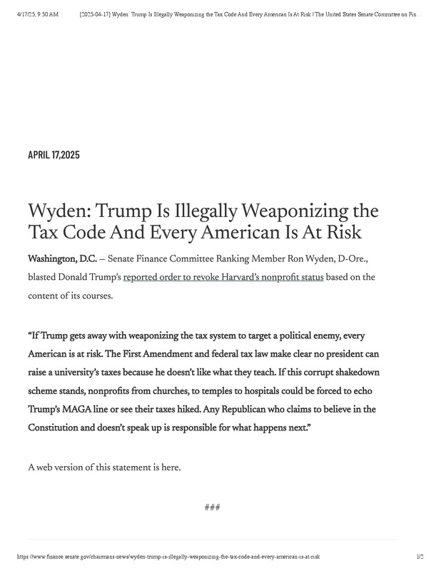 [2025-04-17] Wyden_ Trump Is Illegally Weaponizing the Tax Code And Every American Is At Risk _ The United States Senate Committee on Finance.pdf