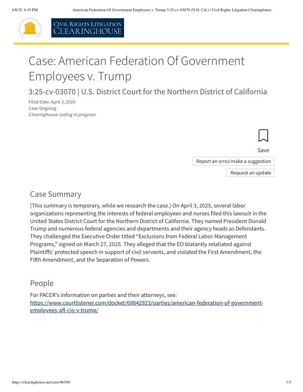 American Federation Of Government Employees v. Trump 3_25-cv-03070 (N.D. Cal.) _ Civil Rights Litigation Clearinghouse.pdf