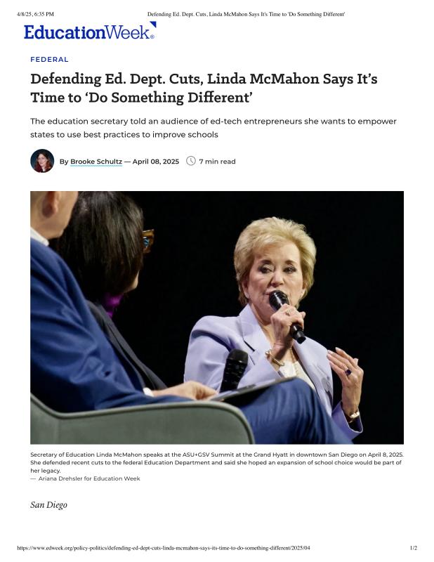 Defending Ed. Dept. Cuts, Linda McMahon Says It's Time to 'Do Something Different'.pdf