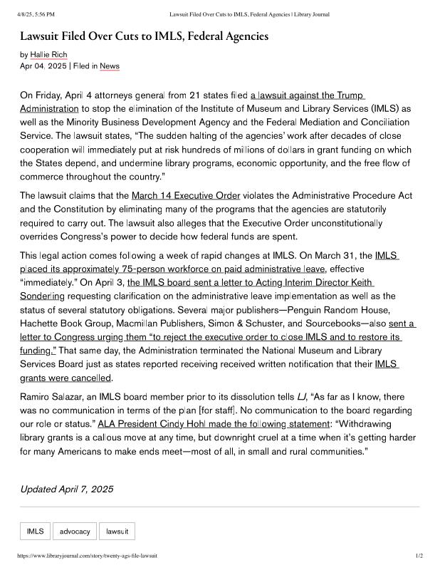 Lawsuit Filed Over Cuts to IMLS, Federal Agencies _ Library Journal.pdf