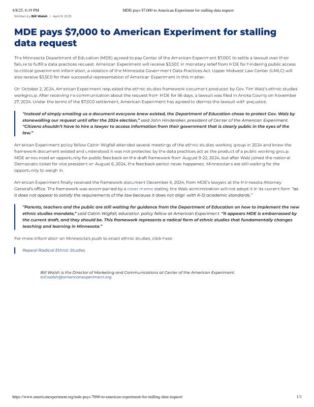 MDE pays 7,000 to American Experiment for stalling data request.pdf