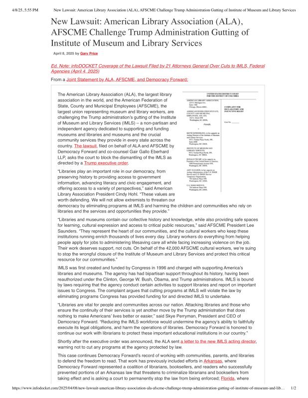 New Lawsuit_ American Library Association (ALA), AFSCME Challenge Trump Administration Gutting of Institute of Museum and Library Services.pdf
