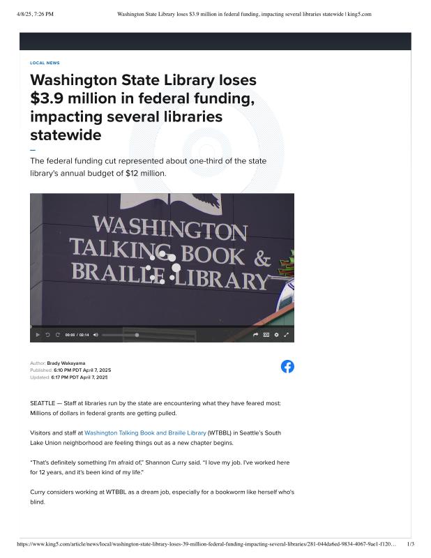 Washington State Library loses 3.9 million in federal funding, impacting several libraries statewide _ king5.com.pdf