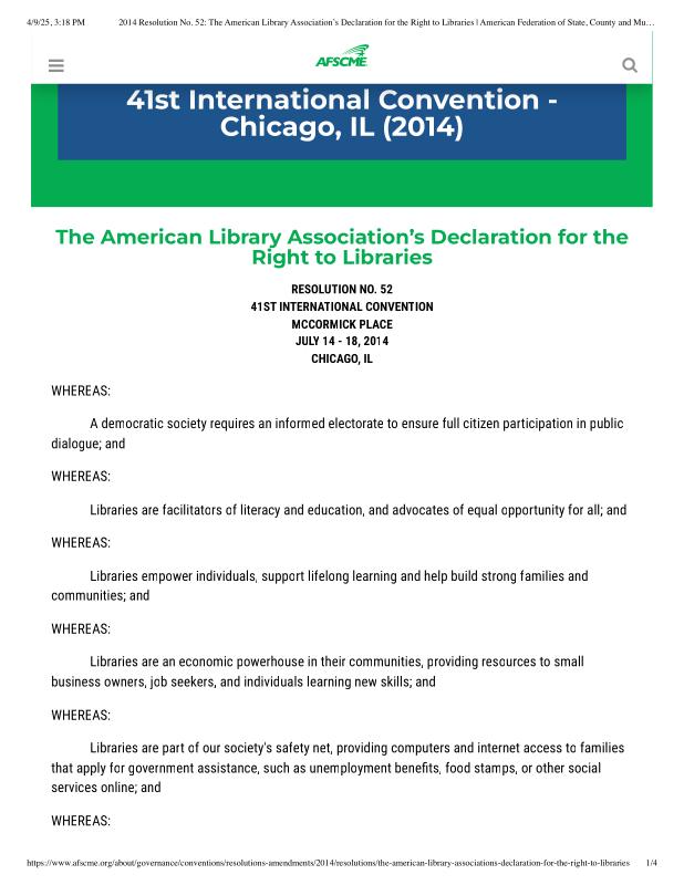 2014 Resolution No. 52_ The American Library Association’s Declaration for the Right to Libraries _ American Federation of State, County and Municipal Employees (AFSCME).pdf