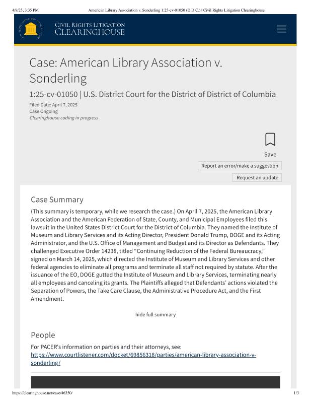 American Library Association v. Sonderling 1_25-cv-01050 (D.D.C.) _ Civil Rights Litigation Clearinghouse.pdf