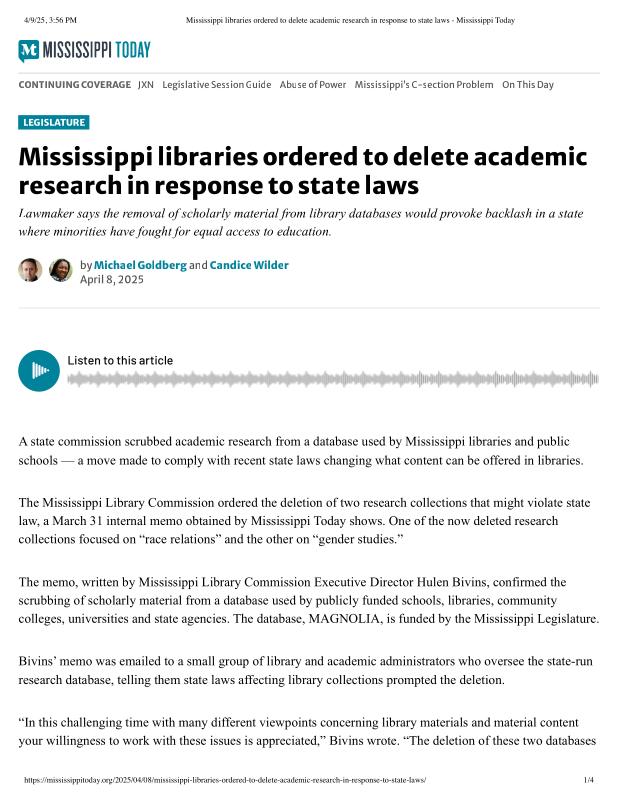 Mississippi libraries ordered to delete academic research in response to state laws - Mississippi Today.pdf