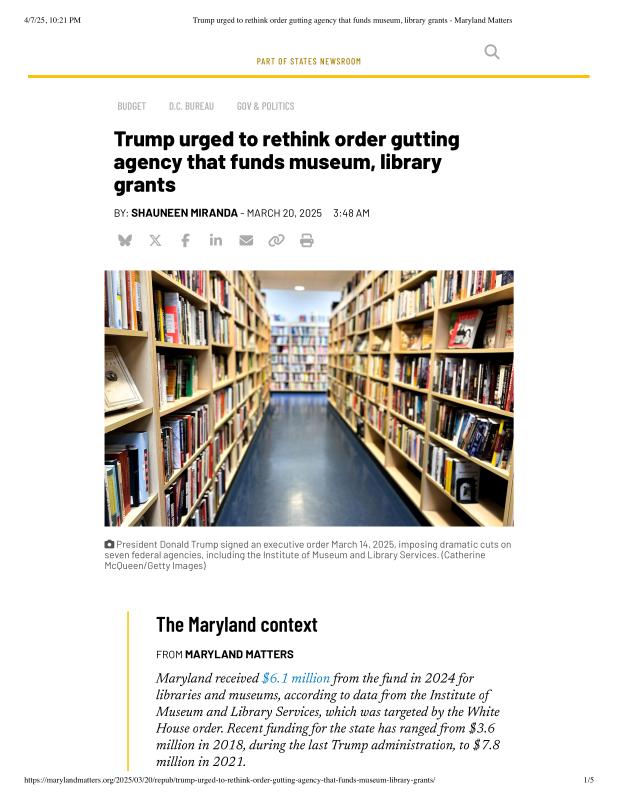 Trump urged to rethink order gutting agency that funds museum, library grants - Maryland Matters.pdf