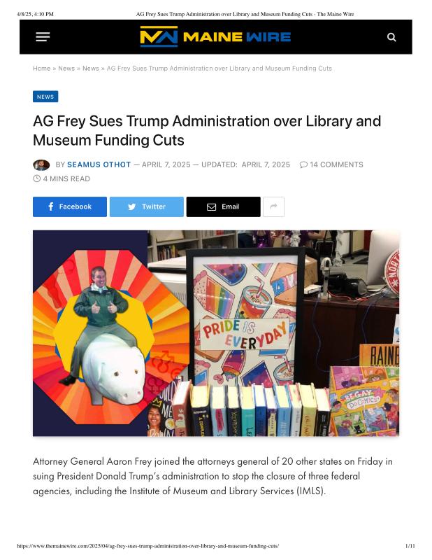 AG Frey Sues Trump Administration over Library and Museum Funding Cuts - The Maine Wire.pdf