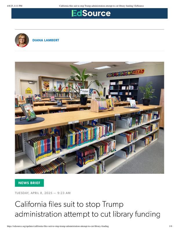 California files suit to stop Trump administration attempt to cut library funding _ EdSource.pdf