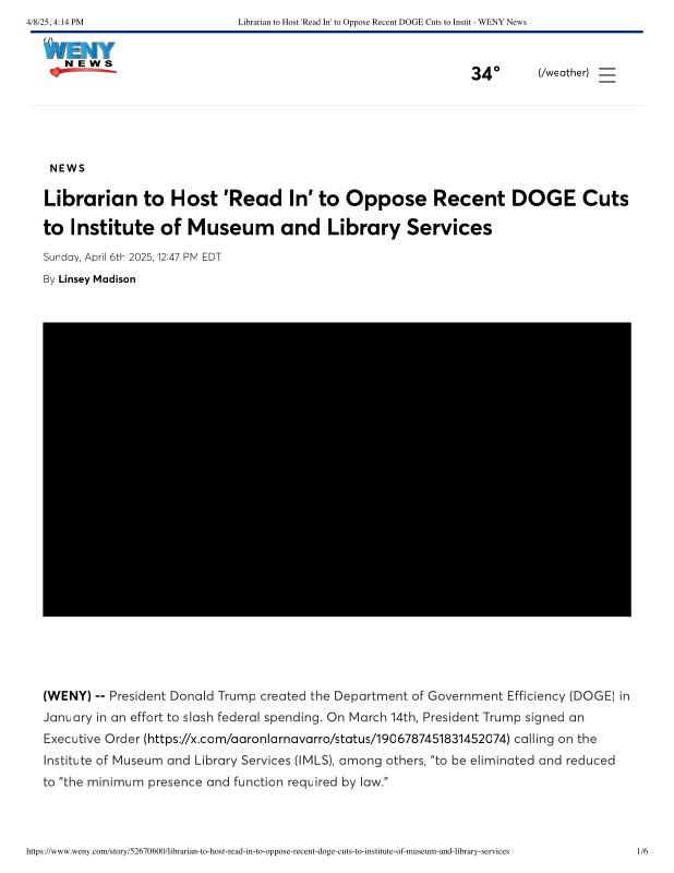 Librarian to Host Read In to Oppose Recent DOGE Cuts to Instit - WENY News.pdf