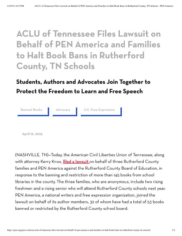 ACLU of Tennessee Files Lawsuit on Behalf of PEN America and Families to Halt Book Bans in Rutherford County, TN Schools - PEN America.pdf