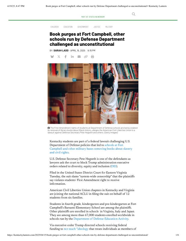 Book purges at Fort Campbell, other schools run by Defense Department challenged as unconstitutional • Kentucky Lantern.pdf