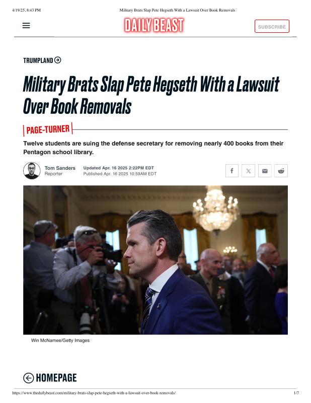 Military Brats Slap Pete Hegseth With a Lawsuit Over Book Removals.pdf