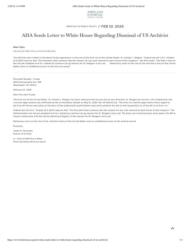 AHA Sends Letter to White House Regarding Dismissal of US Archivist.pdf