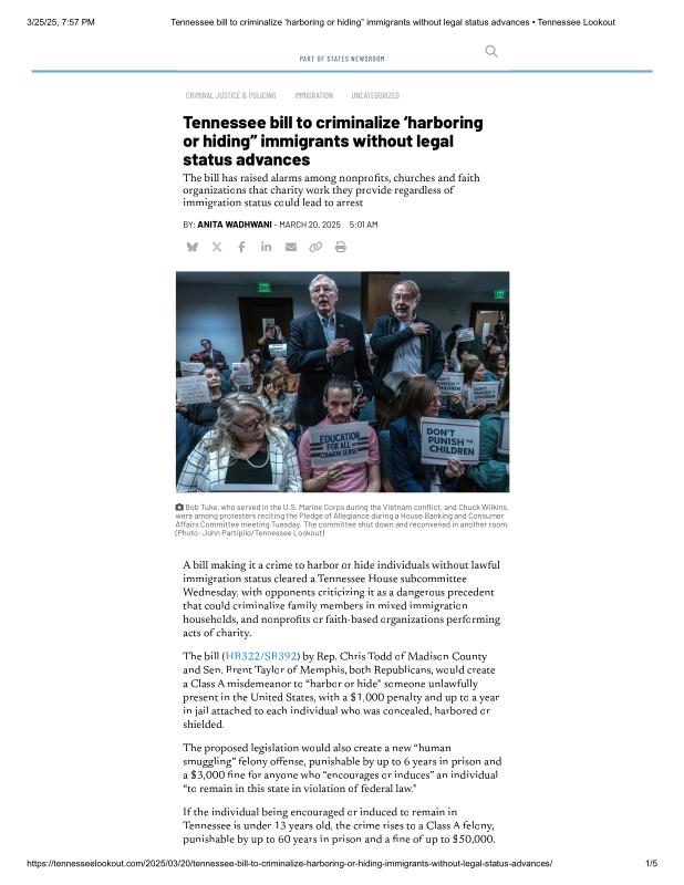 dropbox/COLLECTION- Legal/State Legislation/Tennessee/Tennessee bill to criminalize ‘harboring or hiding” immigrants without legal status advances • Tennessee Lookout.pdf