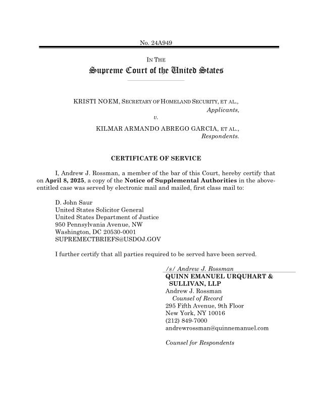 dropbox/COLLECTION- Legal/Supreme Court/No. 24A949/20250408133130242_2025.04.08 Respondents Notice of Supp Authorities - Cert of Service.pdf