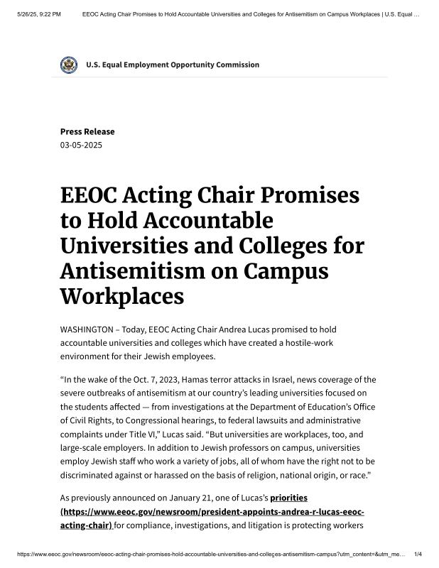 dropbox/COLLECTION- Legal/EEOC/EEOC Acting Chair Promises to Hold Accountable Universities and Colleges for Antisemitism on Campus Workplaces _ U.S. Equal Employment Opportunity Commission.pdf