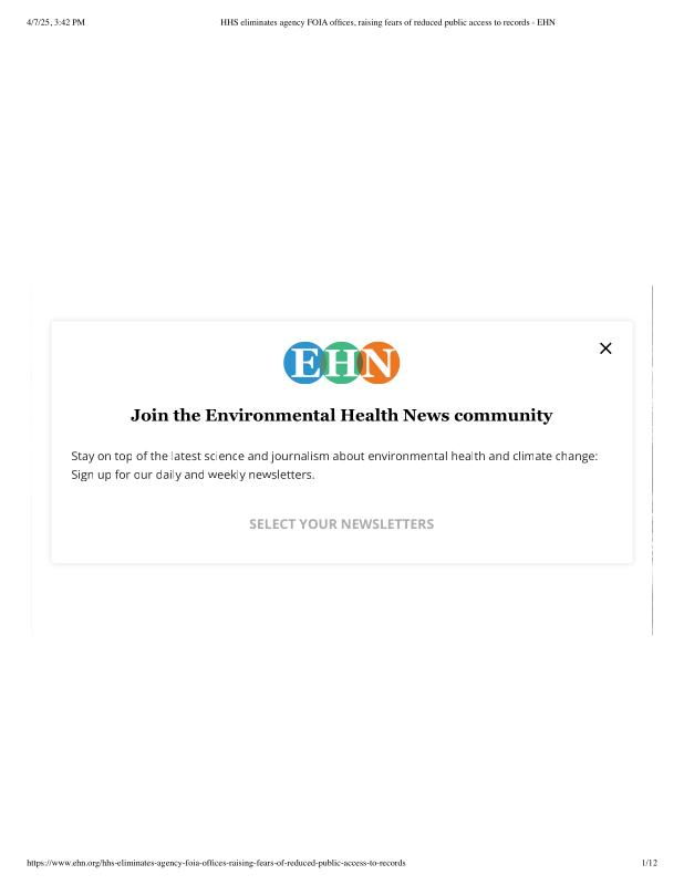 dropbox/COLLECTION- Legal/FOIA and Public Access/FOIA 4-7-25/HHS eliminates agency FOIA offices, raising fears of reduced public access to records - EHN.pdf
