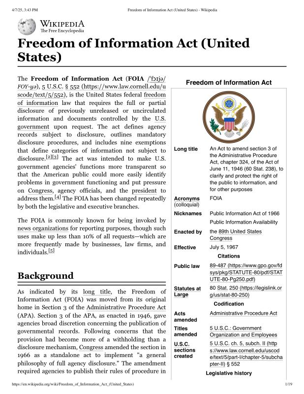 dropbox/COLLECTION- Legal/FOIA and Public Access/FOIA 4-7-25/WIKI Freedom of Information Act (United States) - Wikipedia.pdf