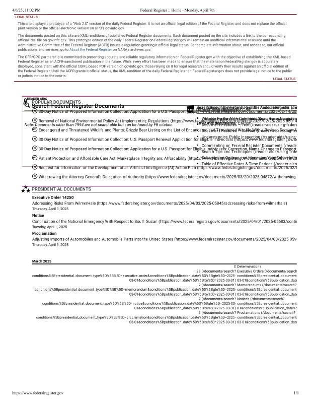 dropbox/COLLECTION- Legal/FOIA and Public Access/Gov FOIA 4-6-25/Federal Register __ Home - Monday, April 7th.pdf
