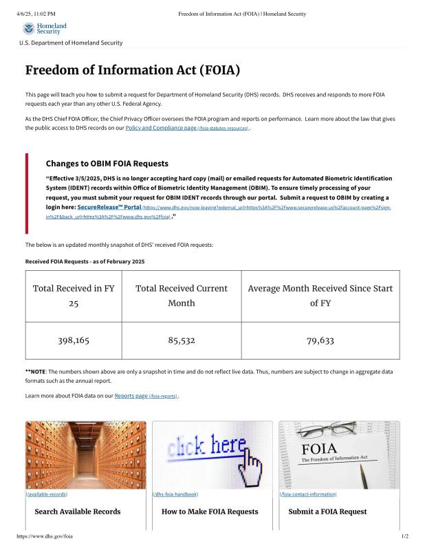 dropbox/COLLECTION- Legal/FOIA and Public Access/Gov FOIA 4-6-25/Freedom of Information Act (FOIA) _ Homeland Security.pdf
