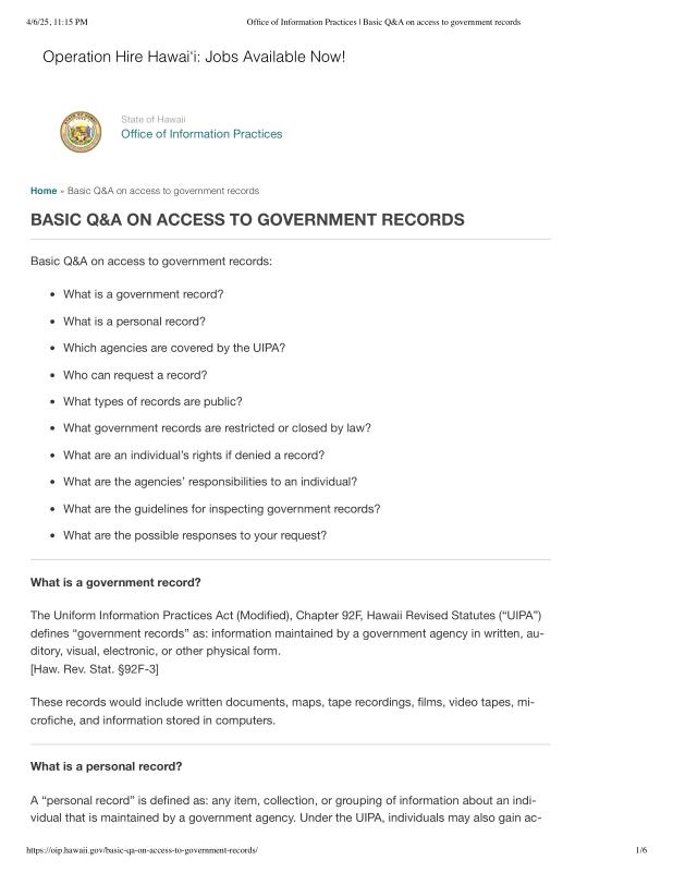 dropbox/COLLECTION- Legal/FOIA and Public Access/Gov FOIA 4-6-25/Office of Information Practices _ Basic Q&A on access to government records.pdf