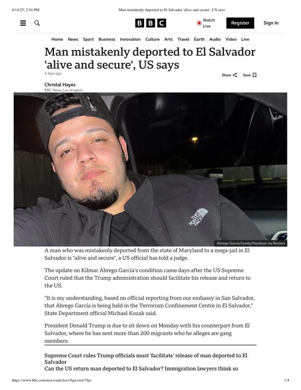 dropbox/COLLECTION- Legal/Kilmar Abrego Garcia/General Information/Man mistakenly deported to El Salvador 'alive and secure', US says.pdf
