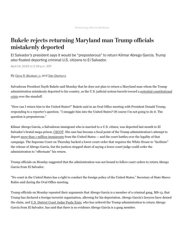 dropbox/COLLECTION- Legal/Kilmar Abrego Garcia/President Bukele/Bukele rejects returning Maryland man Trump officials mistakenly deported - The Washington Post.pdf
