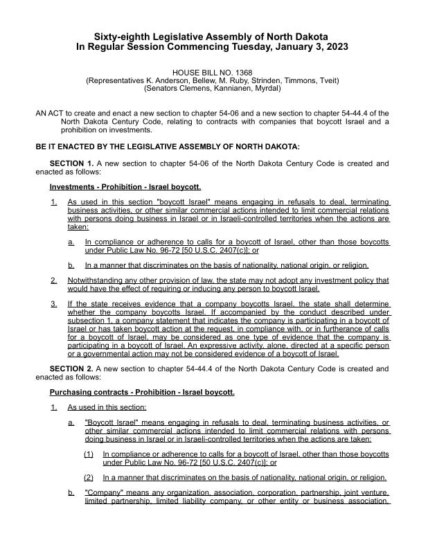 dropbox/COLLECTION- Legal/Laws in the US about Israel/Enrolled House Bill No. 1368 - Sixty-eighth Legislative Assembly of North Dakota - LC Number 23.0802.05000.pdf