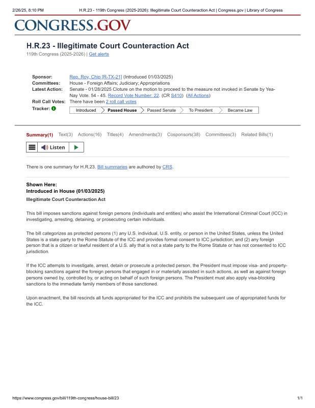 dropbox/COLLECTION- Legal/Laws in the US about Israel/H.R.23 - 119th Congress (2025-2026)_ Illegitimate Court Counteraction Act _ Congress.gov _ Library of Congress.pdf