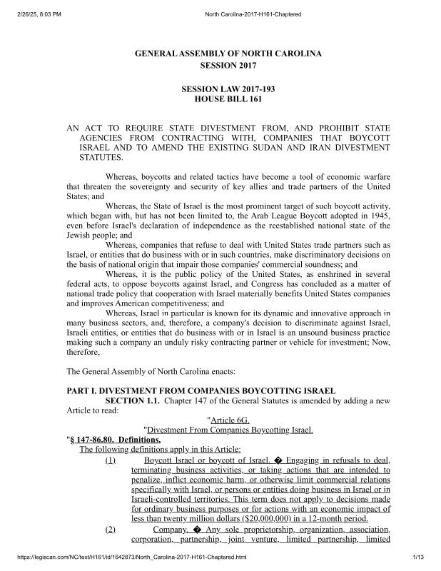 dropbox/COLLECTION- Legal/Laws in the US about Israel/North Carolina-2017-H161-Chaptered.pdf