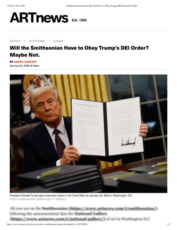 dropbox/COLLECTION- Government/The White House/EO's/trump smithsonian EO/JAN 24 Smithsonian Institution May Not Have to Obey Trump DEI Executive Order.pdf