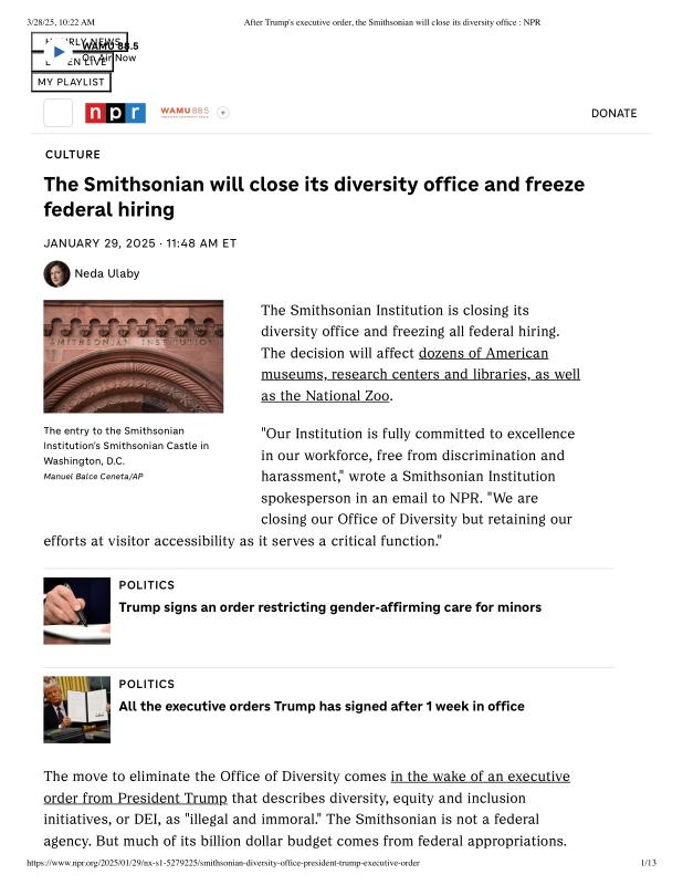 dropbox/COLLECTION- Government/The White House/EO's/trump smithsonian EO/JAN 29 After Trump's executive order, the Smithsonian will close its diversity office _ NPR.pdf