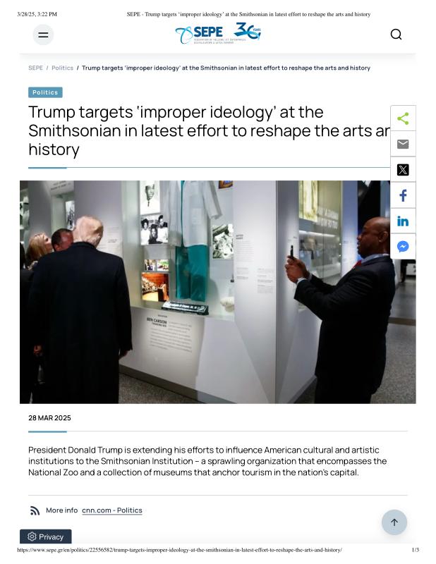 dropbox/COLLECTION- Government/The White House/EO's/trump smithsonian EO/SEPE - Trump targets ‘improper ideology’ at the Smithsonian in latest effort to reshape the arts and history.pdf