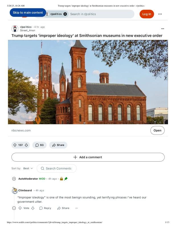 dropbox/COLLECTION- Government/The White House/EO's/trump smithsonian EO/THREAD Trump targets 'improper ideology' at Smithsonian museums in new executive order _ r_politics.pdf