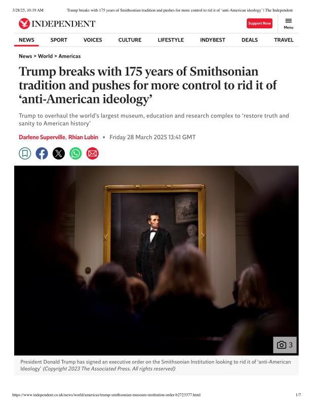 dropbox/COLLECTION- Government/The White House/EO's/trump smithsonian EO/Trump breaks with 175 years of Smithsonian tradition and pushes for more control to rid it of ‘anti-American ideology’ _ The Independent.pdf