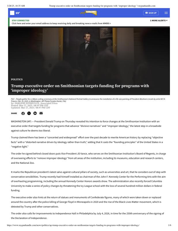 dropbox/COLLECTION- Government/The White House/EO's/trump smithsonian EO/Trump executive order on Smithsonian targets funding for programs with ‘improper ideology’ _ mypanhandle.com.pdf