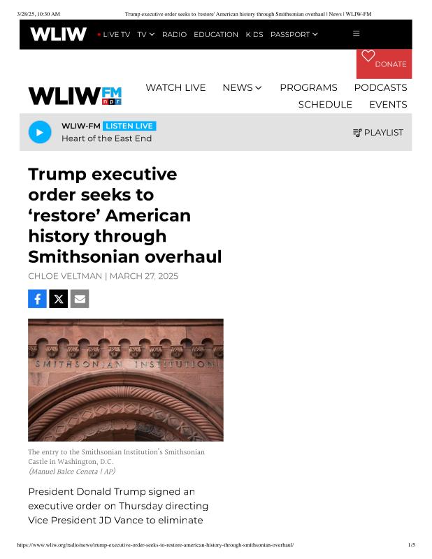 dropbox/COLLECTION- Government/The White House/EO's/trump smithsonian EO/Trump executive order seeks to 'restore' American history through Smithsonian overhaul _ News _ WLIW-FM.pdf