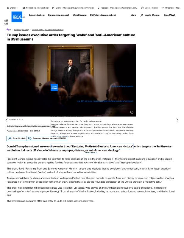 dropbox/COLLECTION- Government/The White House/EO's/trump smithsonian EO/Trump issues executive order targeting ‘woke’ and ‘anti-American’ culture in US museums _ Euronews.pdf