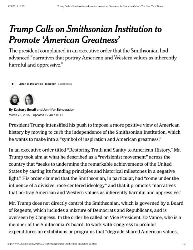 dropbox/COLLECTION- Government/The White House/EO's/trump smithsonian EO/Trump Orders Smithsonian to Promote ‘American Greatness’ in Executive Order - The New York Times.pdf