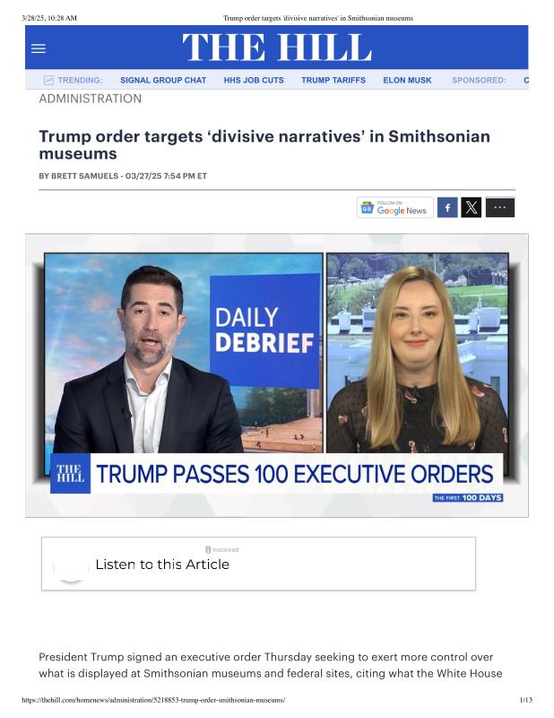 dropbox/COLLECTION- Government/The White House/EO's/trump smithsonian EO/Trump order targets 'divisive narratives' in Smithsonian museums.pdf