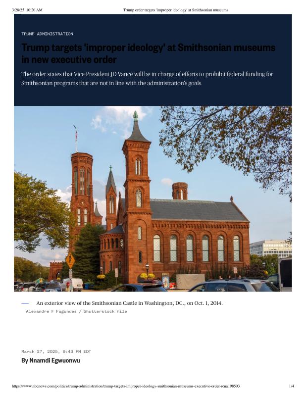 dropbox/COLLECTION- Government/The White House/EO's/trump smithsonian EO/Trump order targets 'improper ideology' at Smithsonian museums.pdf