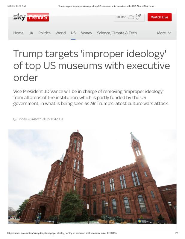 dropbox/COLLECTION- Government/The White House/EO's/trump smithsonian EO/Trump targets 'improper ideology' of top US museums with executive order _ US News _ Sky News.pdf