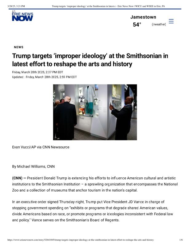 dropbox/COLLECTION- Government/The White House/EO's/trump smithsonian EO/Trump targets ‘improper ideology’ at the Smithsonian in latest e - Erie News Now _ WICU and WSEE in Erie, PA.pdf